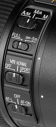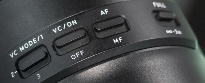 prvky Design přepínačů na objektivu se změnil. Nyní jsou ještě více zapuštěné do těla objektivu. Zde asi trochu praktičnost ustoupila estetice a v nepatrný obměnách mají stejné provedení u všech objektivů s označením G2. Najdete zde přepínač režimu stabilizace (1 normální, 2 stabilizuje pouze vertikálně - vhodné třeba pro sledování rychle se pohybujících předmětů poblíž vodorovné osy a režim 3, kdy již není vidět účinek stabilizace v hledáčku, ale měla by být v tomto režimu nejúčinnější). Dále jsou zde klasické přepínače pro vypnutí/zapnutí stabilizace, automatického ostření a přepínač pro omezení rozsahu ostření od 3 metrů do nekonečna (což zrychluje ostření u objektů nad 3 metry, protože objektiv nemusí projíždět v případě neúspěšného zaostření celý ostřící rozsah). Nikon