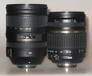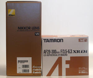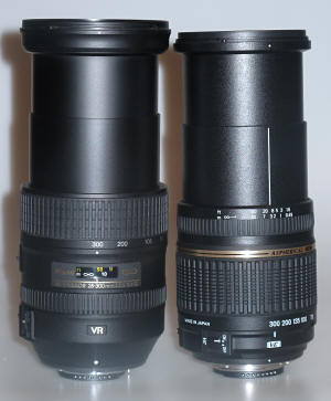 Počet čoček objektivu Nikkor se projevil na jeho váze, Nikkor je těžší o cca 250g, což je v lidové mluvě o čtvrt kila více. Zároveň jsou čočky větší, protože fyzikální zákony jsou zatím neporazitelné a Nikkor má na dlouhém konci lepší světelnost. Průměr filtru u Nikkoru je mi sympatičtější - 77 mm je přesně stejný rozměr, jako mají jeho blízcí profesionální příbuzní - namátkově 24-70/2,8 a 70-200/2,8 a není tedy nutné dokupovat jiný rozměr filtru, pokud tyto objektivy vlastníte. Nikkor je o cca 5.500,- Kč dražší a tom, zda zaslouženě, se budeme muset přesvědčit. Některé pasáže tohoto testu mohu bez uzardění převzít z minulého testu objektivů rozsahu 18-200(270), zvláště svou oblíbenou pasáž o zadní krytce :) Oba objektivy jsou vybaveny vlastními zaostřovacími motory a lze je proto použít i na zrcadlovkách bez motorku ostření. Objektivy nejsou vybaveny clonovými kroužky a nejsou proto použitelné pro starší typy některých zrcadlovek (většinou na kinofilm). K oběma objektivům je v balení sluneční clona, u Nikkoru je hlubší, masivnější. Snad je zbytečné dodávat, že oba objektivy pokrývají obrazové pole plného formátu (u Nikkorů to značí absence zkratky DX, u Tamronů se jedná o zkratku Di). Samozřejmě jsou oba použitelné i na fototparáty se snímačem APS-C, kde díky crop-faktoru obdržíte ohniskovou vzdálenost po přepočtu cca 42 až 450 mm. Vybalujeme Obrazové srovnání velikosti obou objektivů