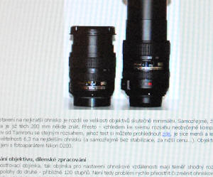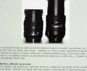 Při nastavení na nejkratší ohnisko je rozdíl ve velikosti objektivů skutečně minimální. Samozřejmě, že u nejdelšího ohniska je již těch 200 mm někde znát. Přesto - vzhledem ke svému rozsahu neobyčejně kompaktní objektiv. Objektiv od Tamronu se stejným rozsahem, jehož test si můžete prohlédnout zde, je sice menší a lehčí, ovšem za cenu světelnosti 6,3 na nejdelším ohnisku (a samozřejmě bez stabilizace, za nižší cenu...). Objektiv byl testován ve spojení s fotoaparátem Nikon D200 a D2x.