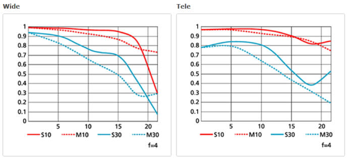 Podívejme se na MTF křivky: Pokud se vám to nezdá nic extra, tak se podívejte na ostrost a kontrast objektivu Nikon 24-120/4, který je na tom při daleko menším rozsahu ohnisek podstatně hůře: Stále platí - čím výše jsou křivky na grafu (kontrast) a čím blíže u sebe (astigmatismus), tím lépe. Změna clonového čísla dle ohniskové vzdálenosti
