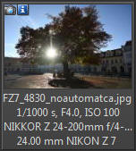 Světelnost objektivu poměrně rychle klesá se vzrůstající ohniskovou vzdáleností (graf sestaven dle změny clonového čísla na displeji fotoaparátu). Již na ohniskové vzdálenosti 80 mm je dosaženo světelnosti 6,3. Úbytek světelnosti objektivu je tak dosti strmý. Přesuňme se od grafů k reálným fotografiím. Fotoaparát Nikon Z7 (Zpracování v Nikon Capture NX-D: Picture CTRL STANDARD, QUCK SHARP 0, SHARPENING 4, M-RANDGE SHARP +2, CLARITY +1, D-LIGHT NORMAL, VIGNETE control 42, ostatní hodnoty 0, Lateral Color Aberration - ON, Auto Distortion Control - ON, AF-S, RAW 12bit, převod do JPG nejvyšší kvality v programu Capture NX-D. Bezvětří pevný stativ. Výřez odpovídá tiskové velikosti fotografie cca 120 x 160 cm!!! Převod všech snímků v programu Nikon Capture NX-D z formátu RAW do JPG 100% kvalita. Závěr: Nečekal jsem zázraky a také se žádný nedostavil. Při tomto ohniskovém rozsahu to zkrátka musí být kompromis, fyziku člověk neokecá (při této ceně objektivu). Na některých ohniskových vzdálenostech se v okrajových částech nepodařilo programu Capture NX-D odstranit aberaci - a to se stává skutečně málokdy. Na velkoformátové fotografie krajin a architektury nebude tento objektiv nejlepší volba.