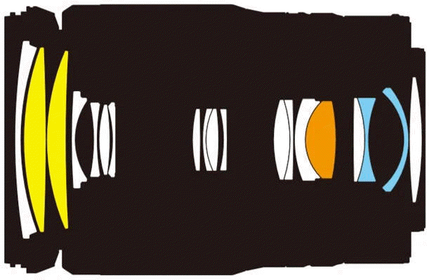 19 čoček / 15 členů (včetně 2 optických členů ze skla ED, 1 asférického optického členu ze skla ED, 2 asférických optických členů, optických členů s antireflexními vrstvami ARNEO a předního optického členu s fluorovou vrstvou. Utěsnění proti stříkající vodě a prachu, elektromagnetická clona, krokový bezhlučný zaostřovací STM motor, optická stabilizace až 5 EV.