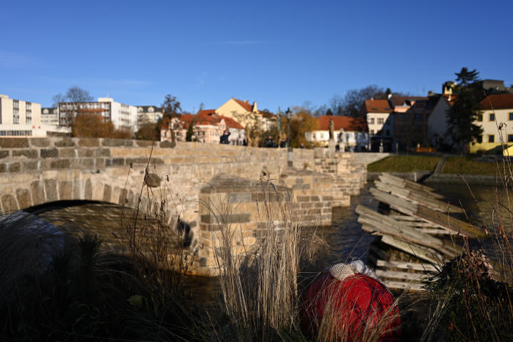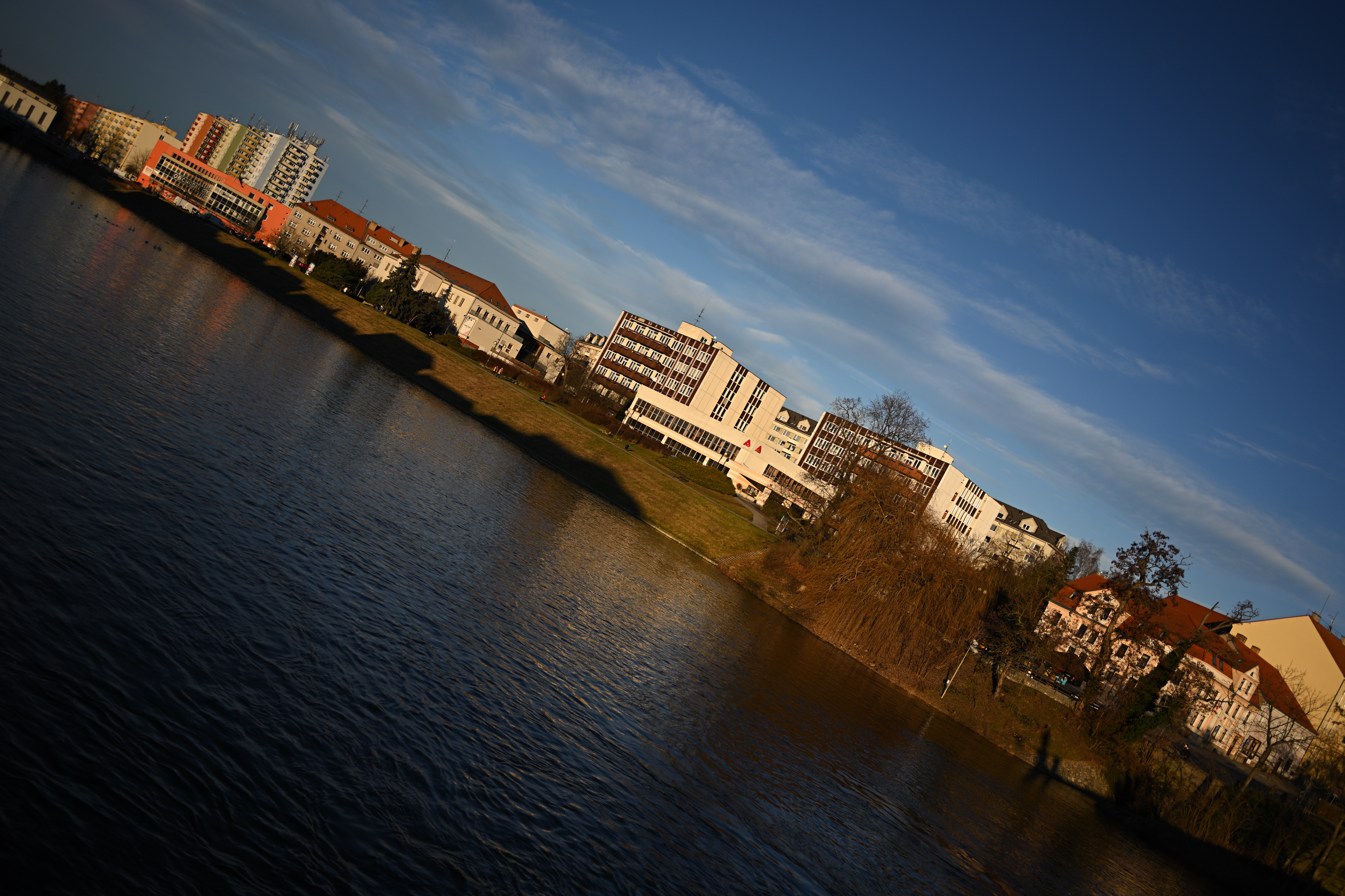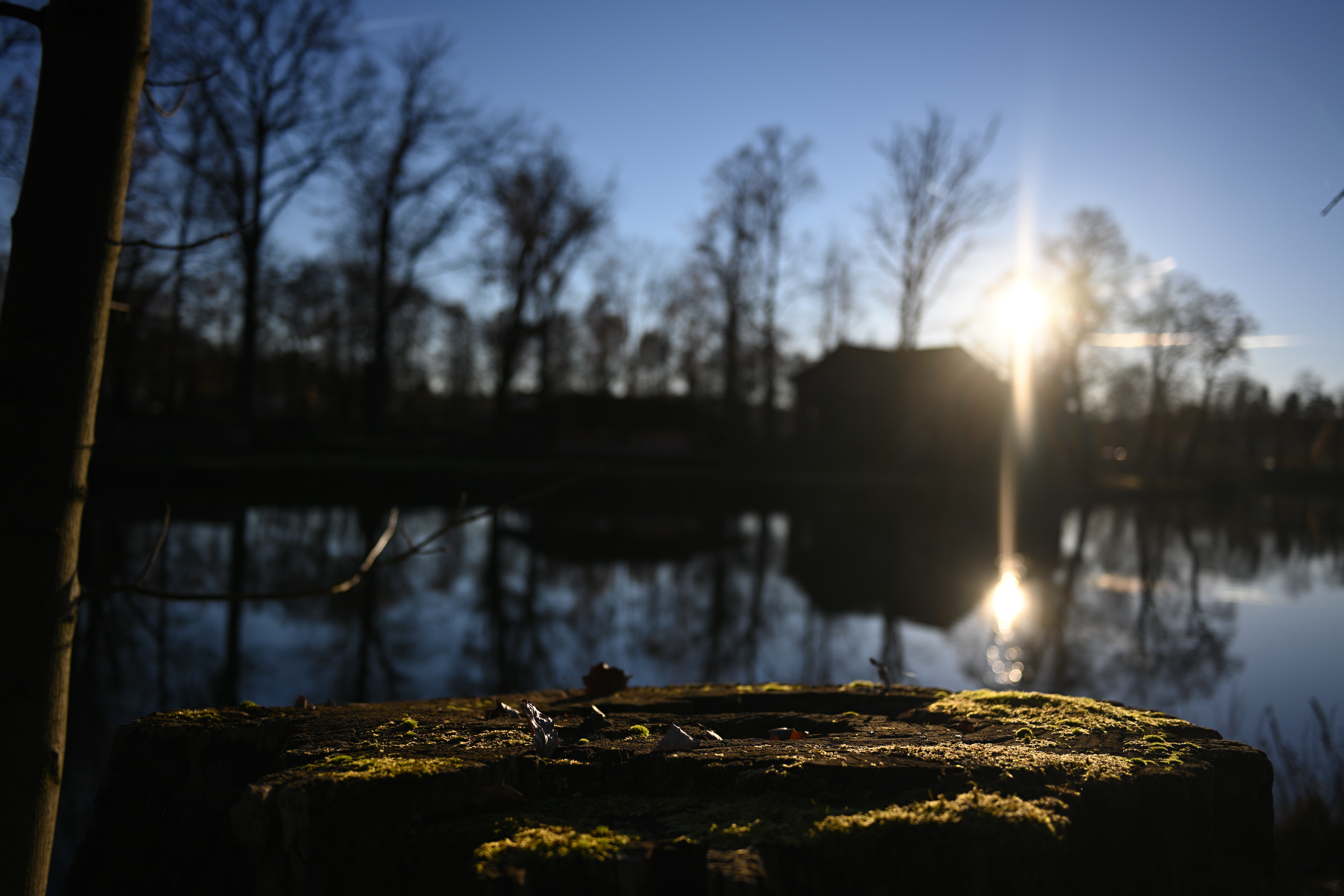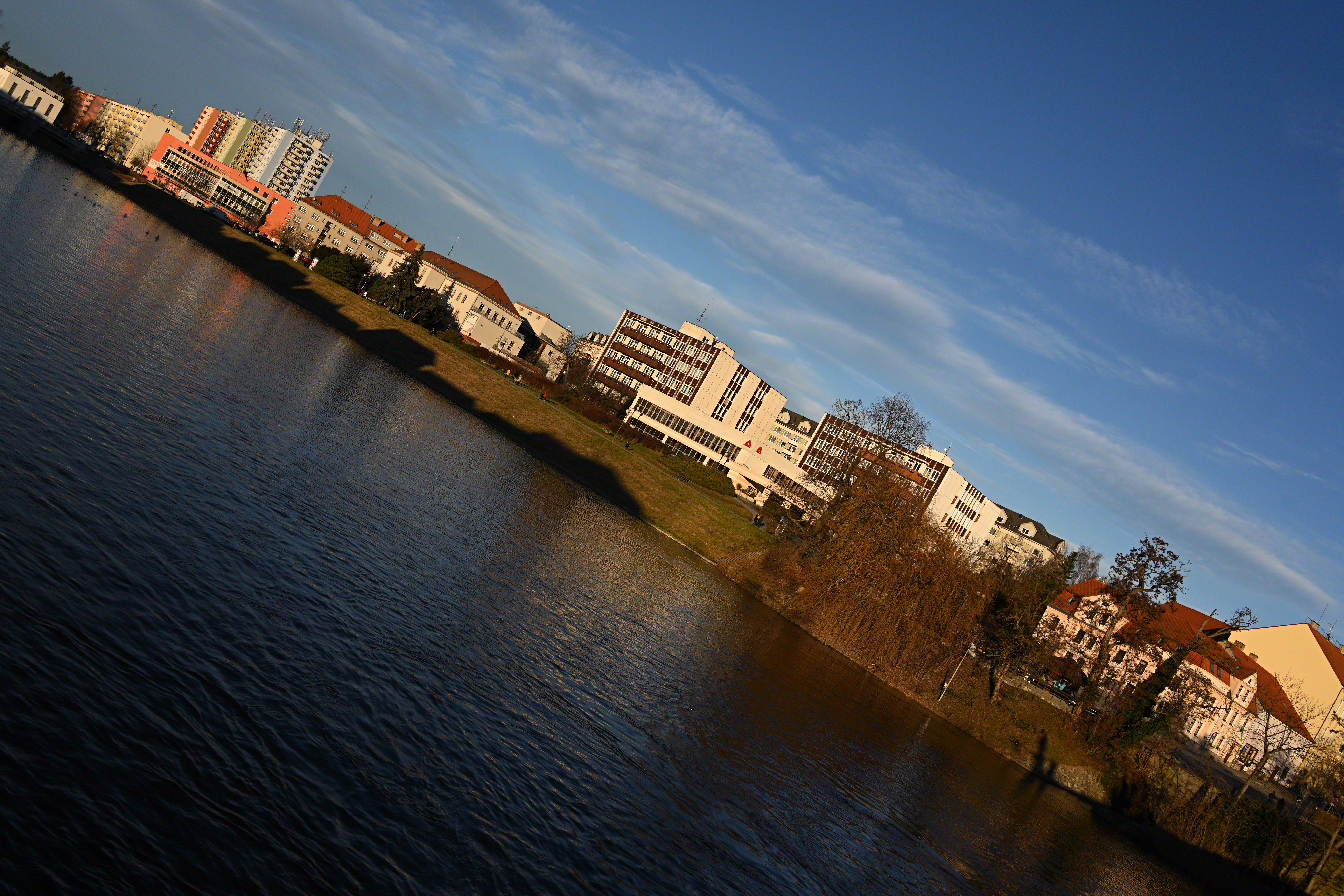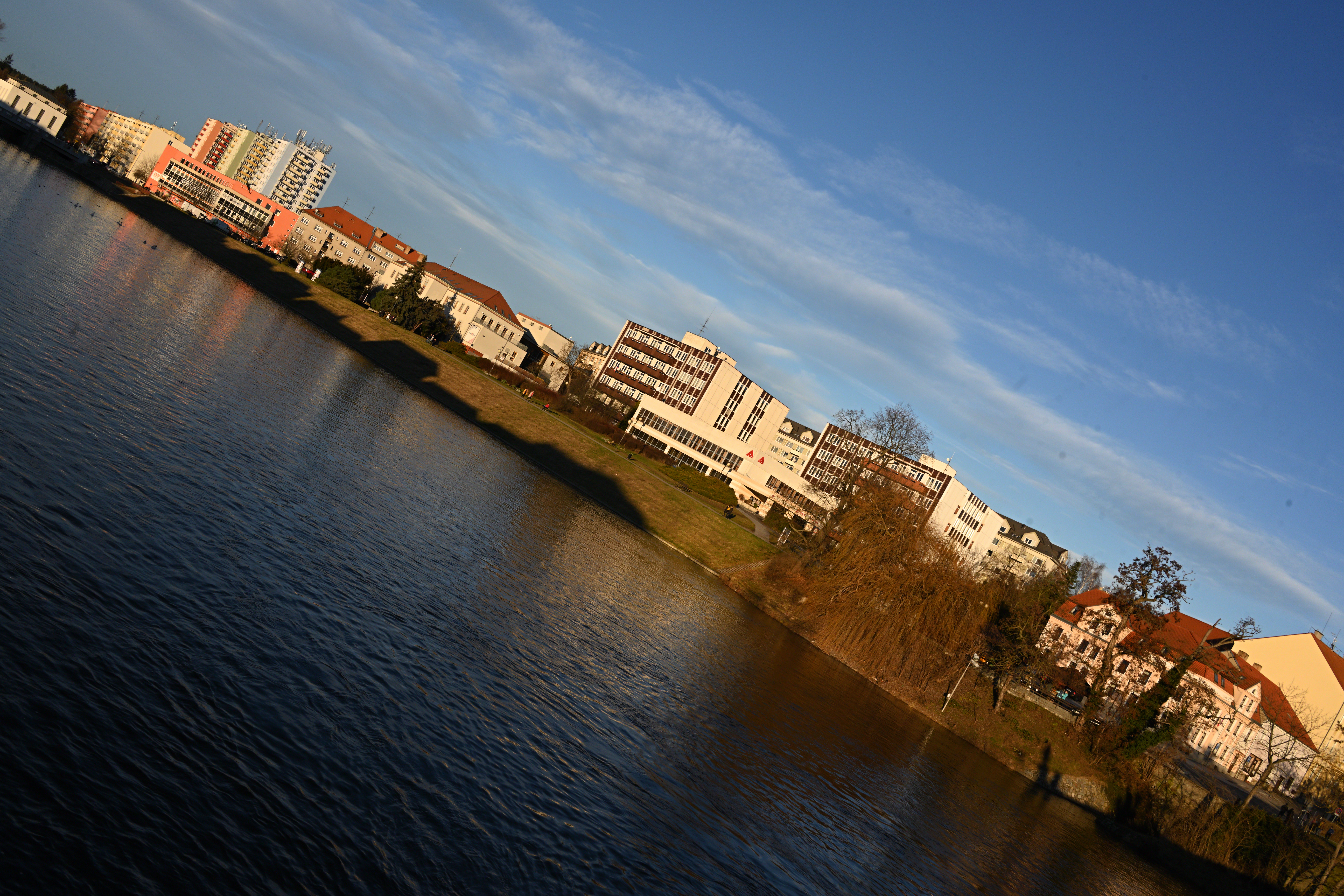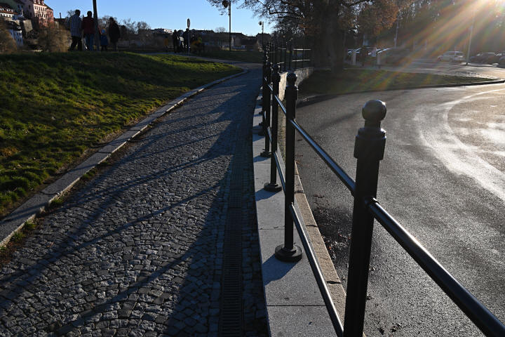 Aberaci, pokud je skutečně velká, nejde v editoru zcela odstranit. Projevuje se nevíce na nejnižším clonovém čísle a na rozmezí tmavých a světlých částí obrazu ve formě většinou fialových (v pozadí) nebo zelených obrysů (v popředí) - nejvíce na okrajích - učebnicovým příkladem jsou právě odlesky na tmavé vodní hladině, jemné větvičky stromů nebo odlesky na chromovaných předmětech či dlažebních kostkách. Výřezy odpovídají tiskové velikosti 180x120 cm, zobrazení na monitoru 1:1. Pokud chcete nějaký objektiv opravdu potrápit, tak odlesky na vodě v protisvětle nebo plechové cedule jsou zaručenou jistotou. Následující snímek je asi to nejhorší, co se mi podařilo ze všech snímků pořízených na clonové číslo 2,8 najít: Bez korekce Po automatické korekci aberace v Nikon Capture NX-D Nedá se tvrdit, že by se aberace nějak drasticky snižovala se zvyšujícím se clonovým číslem. Ale objevuje se prakticky pouze v okrajových částech obrazu a na drtivé většině snímků se jí podaří dobře odstranit. Zde odlesky na vodě, clonové číslo 2,8: