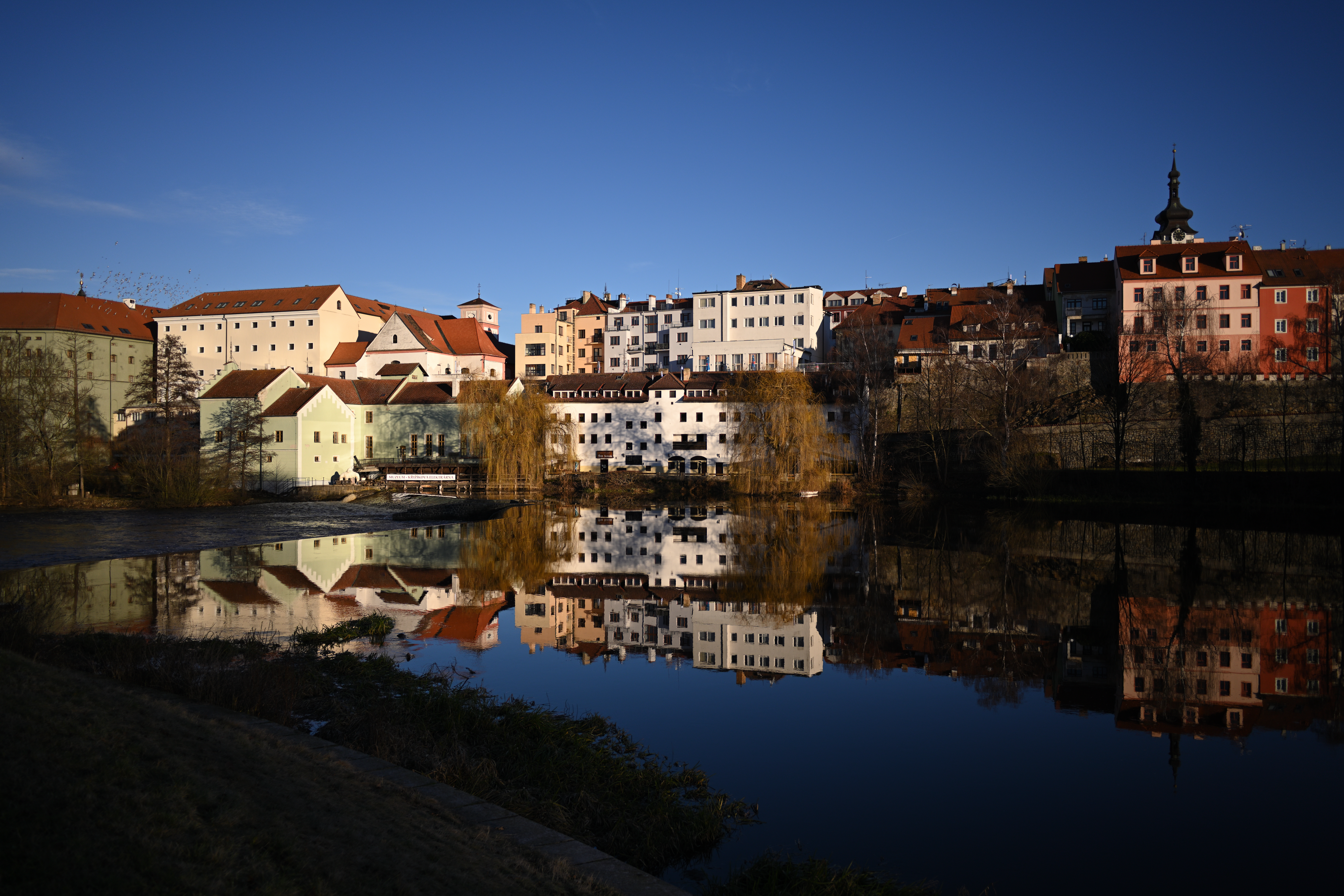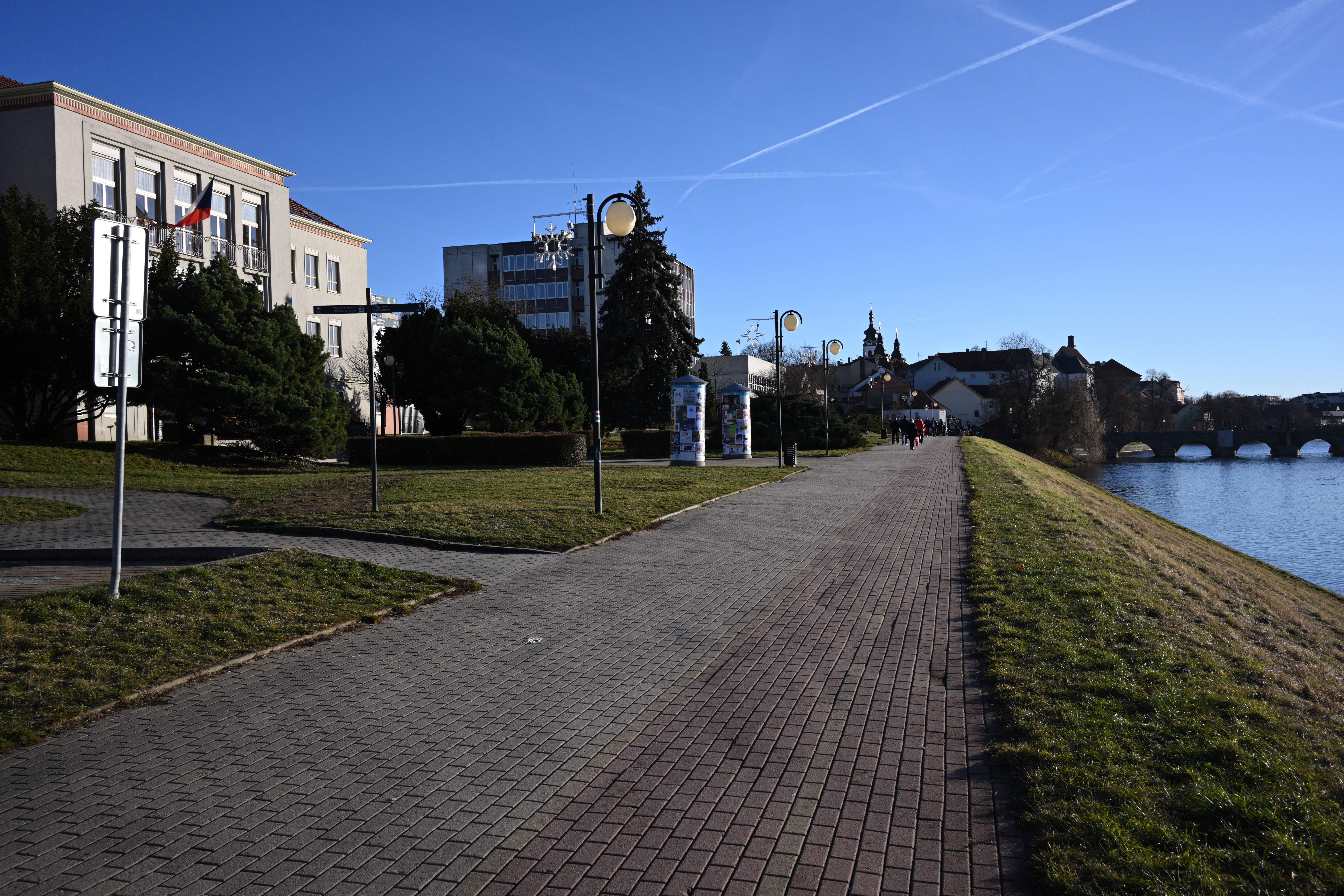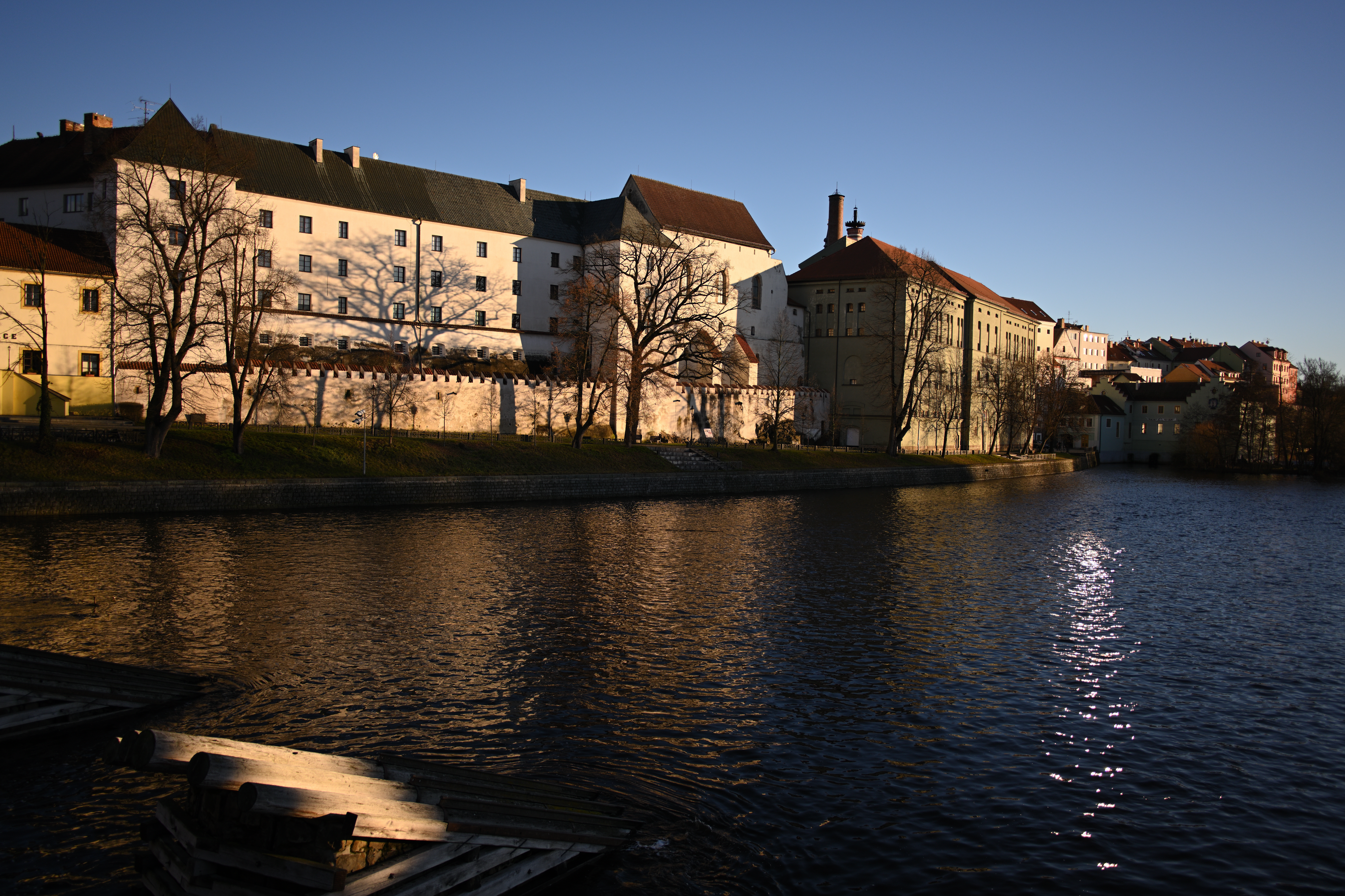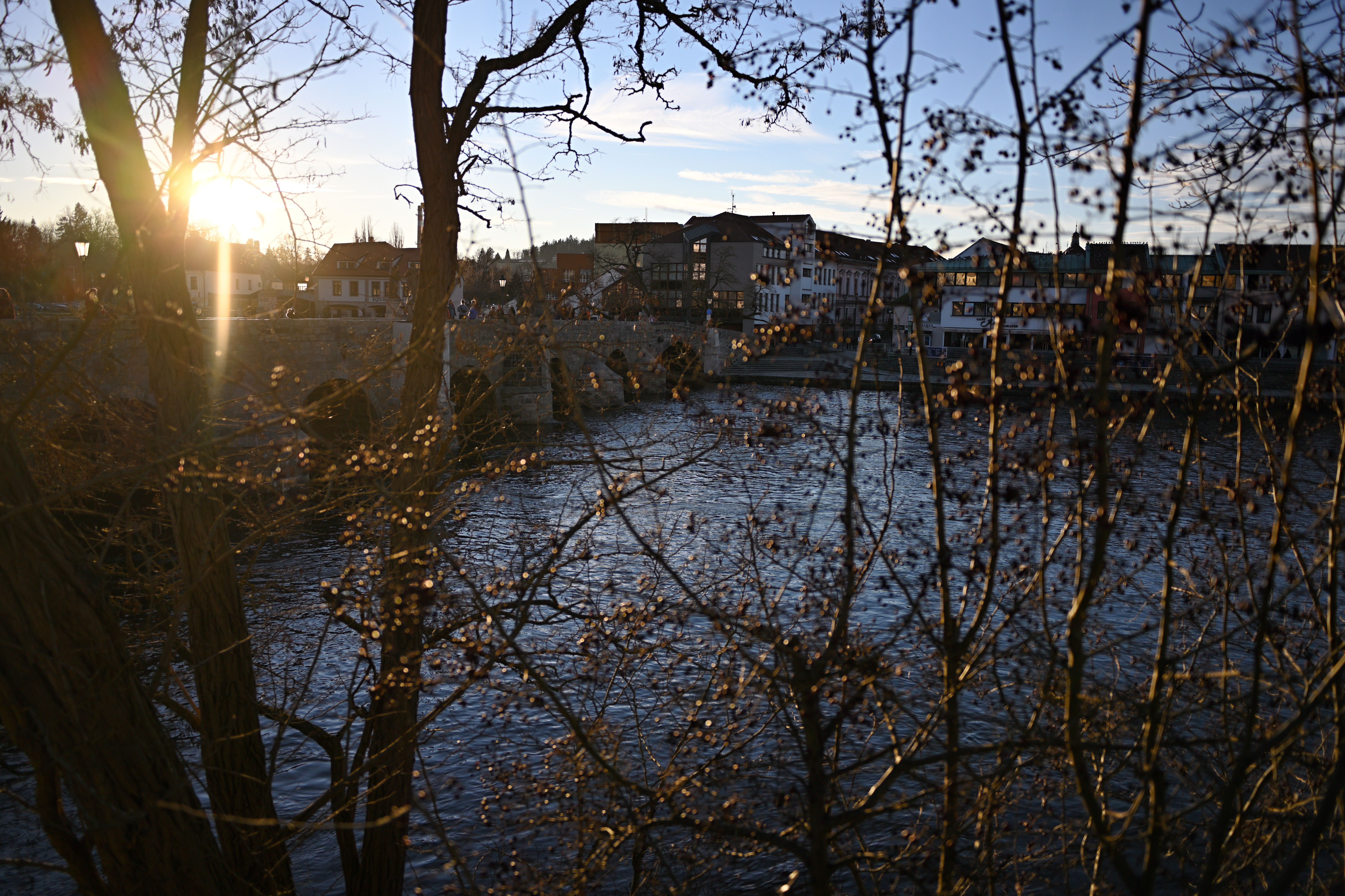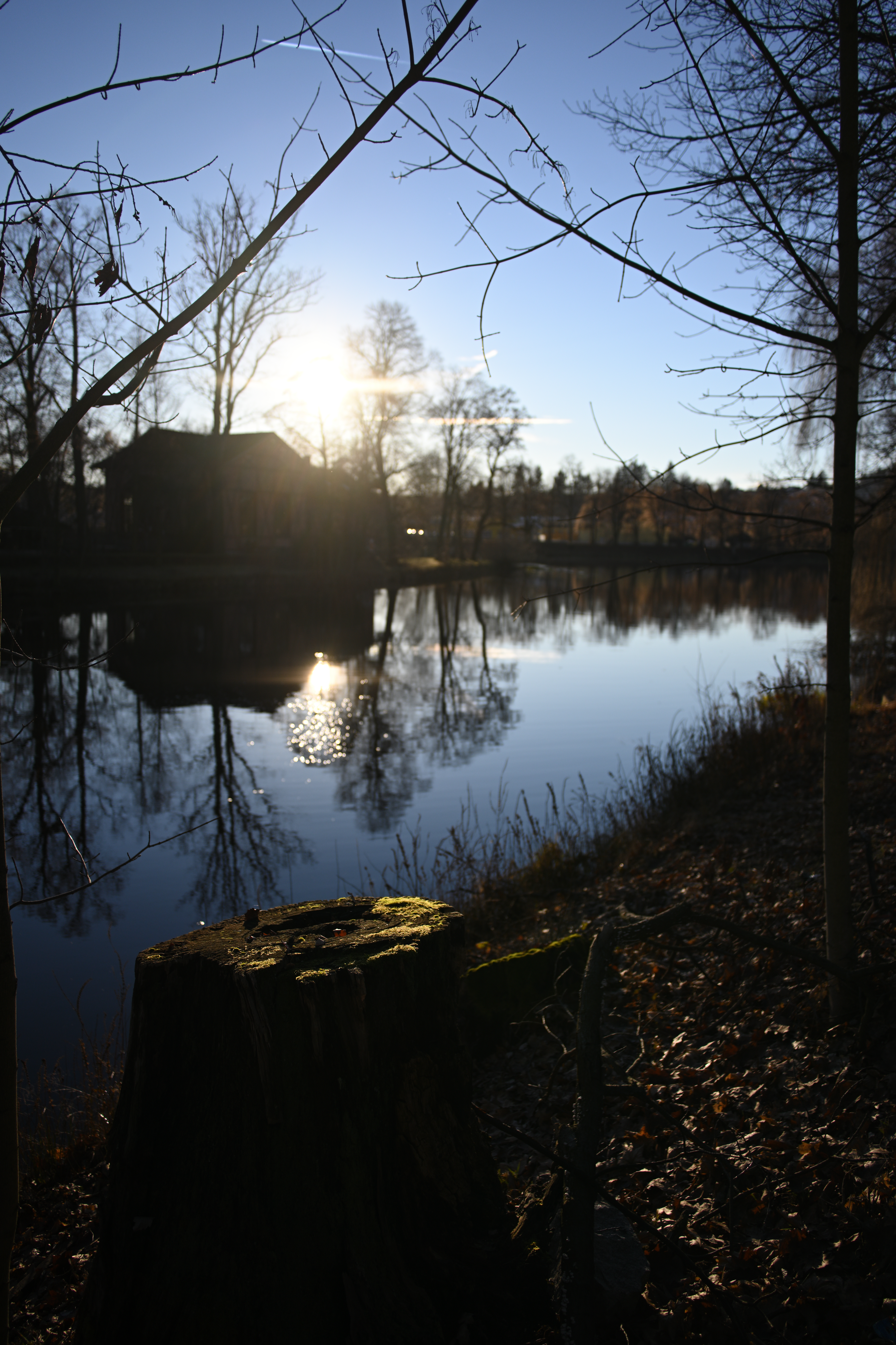 Aberaci, pokud je skutečně velká, nejde v editoru zcela odstranit. Projevuje se nevíce na nejnižším clonovém čísle a na rozmezí tmavých a světlých částí obrazu ve formě většinou fialových (v pozadí) nebo zelených obrysů (v popředí) - nejvíce na okrajích - učebnicovým příkladem jsou právě odlesky na tmavé vodní hladině, jemné větvičky stromů nebo odlesky na chromovaných předmětech či dlažebních kostkách. Výřezy odpovídají tiskové velikosti 180x120 cm, zobrazení na monitoru 1:1. Pokud chcete nějaký objektiv opravdu potrápit, tak odlesky na vodě v protisvětle nebo plechové cedule jsou zaručenou jistotou. Následující snímek je asi to nejhorší, co se mi podařilo ze všech snímků pořízených na clonové číslo 2,8 najít: Bez korekce Po automatické korekci aberace v Nikon Capture NX-D Nedá se tvrdit, že by se aberace nějak drasticky snižovala se zvyšujícím se clonovým číslem. Ale objevuje se prakticky pouze v okrajových částech obrazu a na drtivé většině snímků se jí podaří dobře odstranit. Zde odlesky na vodě, clonové číslo 2,8:
