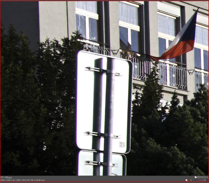 Dobrá zpráva: objektiv je ve středové části obrazu velmi přijatelně ostrý již od nejnižšího clonového čísla 2,8 a nejostřejší na clonových číslech 4 až 8 (nejlepší na 5,6). Na vyšších clonových číslech se již projevuje výrazně difrakce. Co platí o středu, neplatí na nejnižších clonových číslech o rozích snímku. Na clonovém čísle 2,8 jsou rohy dosti rozpatlané, k čemuž přispívá na clonových číslech 2,8 a 4 aberace - je viditelná i přes zapnuté automatické odstranění aberace. Okraje snímku jsou na nejnižších clonách i přes automatické odstranění vinětace viditelně tmavší a vinětaci by bylo nutné ještě ručně doladit. Levý dolní roh je u mého kusu objektivu na clonových číslech 2,8 a 4 podstatně méně ostrý než pravý dolní roh. Závěr: Opět musím opakovat, že výřezy odpovídají tiskové velikosti 120x180 cm a je třeba to vzít vždy při hodnocení v úvahu. Pokud by někdo nabyl dojmu, že jsou to velmi špatné výsledky, není tomu tak, pokud si uvědomíme cenovou kategorii tohoto objektivu. Potěšitelné je, že je ve středu ostrý již od clonového čísla 2,8 a od clonového čísla 4 do 8 obdržíte výborné výsledky téměř v celé ploše obrazu. Stejně tak okraje snímku mimo úplných rohů jsou na tom také podstatně lépe, jak dokládá následující snímek pořízený na clonové číslo 2,8: