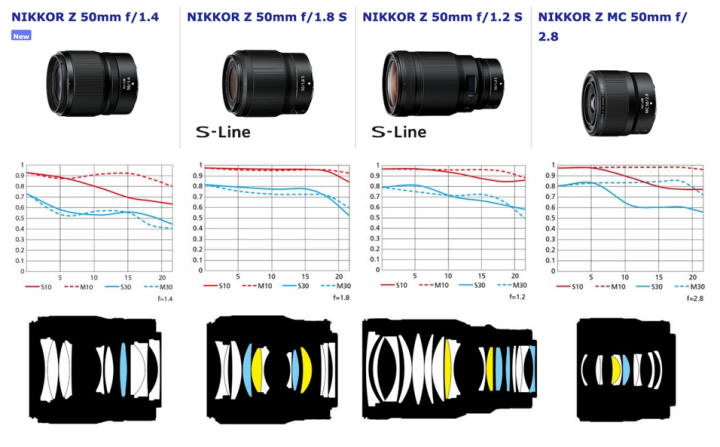 Na úvod MTF křivky (více o MTF křivkách zde) MTF křivky jsou docela věrným odrazem toho, co do objektivu očekávat. Na první pohled je vidět, že tato padesátka nebude žádným přeborníkem v ostrosti - a zcela zjevně jím také nemá být. To je zcela jasně vidět porovnáním MTF křivek, které skutečně nevypadají tak, jak jsme u Nikon Z objektivů zvyklí, i když přihlédneme k tomu, že jsou uváděny na clonovém čísle 1.4, zatímco u Nikon Z 50/1.8 jsou na clonovém čísle 1.8. Ale i kdybychom viděli MTF graf na clonovém čísle 1.8, jistě bychom se nedočkali dramatického zlepšení. Bližší uvidíme v porovnávacím testu. Je zřejmé, že objektiv nemá žádné ED členy a pouze jeden asférický člen a to se musí někde projevit - otázkou je, jak moc. Pokud jste byli či stále jste vlastníkem objektivu Nikkor F 50/1.4 G (na F bajonet - stále se prodává za cca 12.500,- Kč), tak vidíte, že objektiv na zetku je na tom (nejen) s ostrostí mnohem lépe: