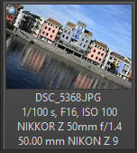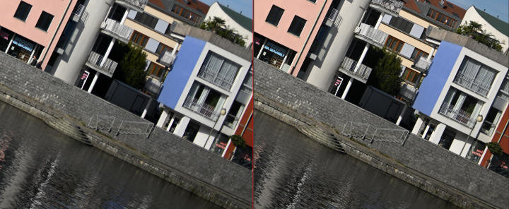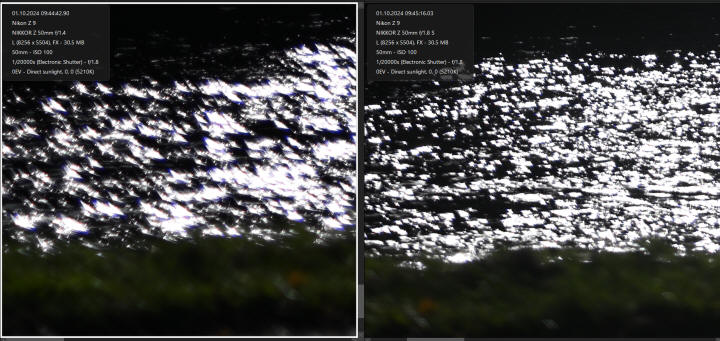 Následující čtveřice snímků je bez odstraňování aberace na různých clonových číslech. "Rejnoci" začínají mizet někde kolem clonového čísla 2.8. Někde kolem clonového čísla 8 začíná mizet axiální aberace (fialová) postupně ubývá se začíná objevovat laterální (zelená). Závěr: Netřeba to dále pitvat. Nikon Z 50/1.4 má aberaci výrazně vyšší než objektiv Nikon Z 50/1.8 S. Ale snad nic horšího než odlesky na vodě v přímém slunečním protisvětle na testování aberace nenajdete a proto vás již nic horšího nečeká. Naštěstí to není typický krajinářský objektiv (navíc krajiny se málokdy fotí na clonové číslo 1.4). Tak se nenechte vystrašit, u normálních snímků to není nijak tragické, i když je pravdou, že na jemné tkanině na židli (viz výše) je aberace hodně výrazná a odstraňuje se v těchto případech dost špatně.