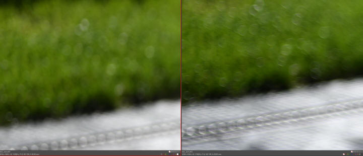 50/1.8 S (vpravo) - oba shodně na clonovém čísle 1.8: Se zapnutým odstraňováním aberace v programu NX Studio - Laterální, Axiální na max. hodnotě 100: V obou objektivech jsou dosti výrazné rozdíly jak v aberaci samotné, tak i ve tvaru odlesků v okrajové části obrazu - vidíte ty malé "rejnoky" u 1.4? S těmi jsem se naposled snad setkal před mnoha lety u Tamronů. Ačkoliv jsem dal v programu NX Studio maximální hodnoty, stejně tam u 1.4 nějaká aberace zůstala. Jsou ovšem případy, kde by byl nutný ruční zásah, protože ani maximální korekce aberace nemá ve snímku žádný účinek: