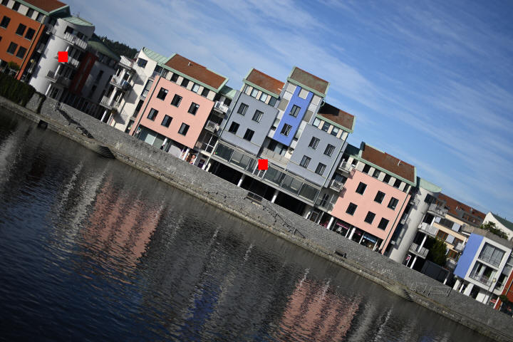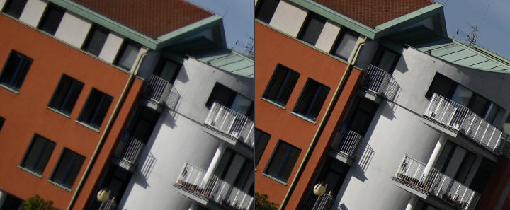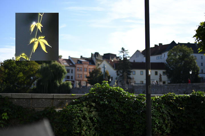 Aberaci, pokud je skutečně velká, nejde v editoru zcela odstranit. Projevuje se nevíce na nejnižším clonovém čísle a na rozmezí tmavých a světlých částí obrazu ve formě většinou fialových (v pozadí) nebo zelených obrysů (v popředí) - nejvíce na okrajích - učebnicovým příkladem jsou právě odlesky na tmavé vodní hladině, jemné větvičky stromů nebo odlesky na chromovaných předmětech či dlažebních kostkách. Výřezy odpovídají tiskové velikosti 180x120 cm, zobrazení na monitoru 1:1. Na