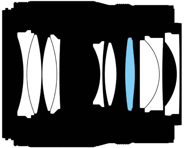 Asférický člen, žádné ED a Super ED prvky Objektiv má 10 prvků v 7 skupinách - Nikon se nezmiňuje o žádných antireflexních vrstvách a jiných zušlechťovacích procesech optiky.